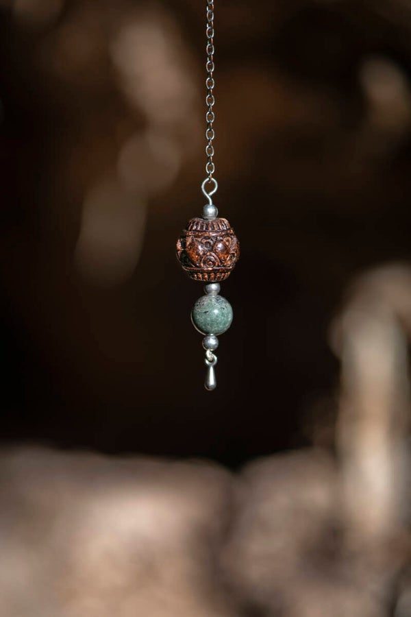 Pic à cheveux artisanal en bois brut. Bijoux en acier inoxidable et perle en pierre fine.